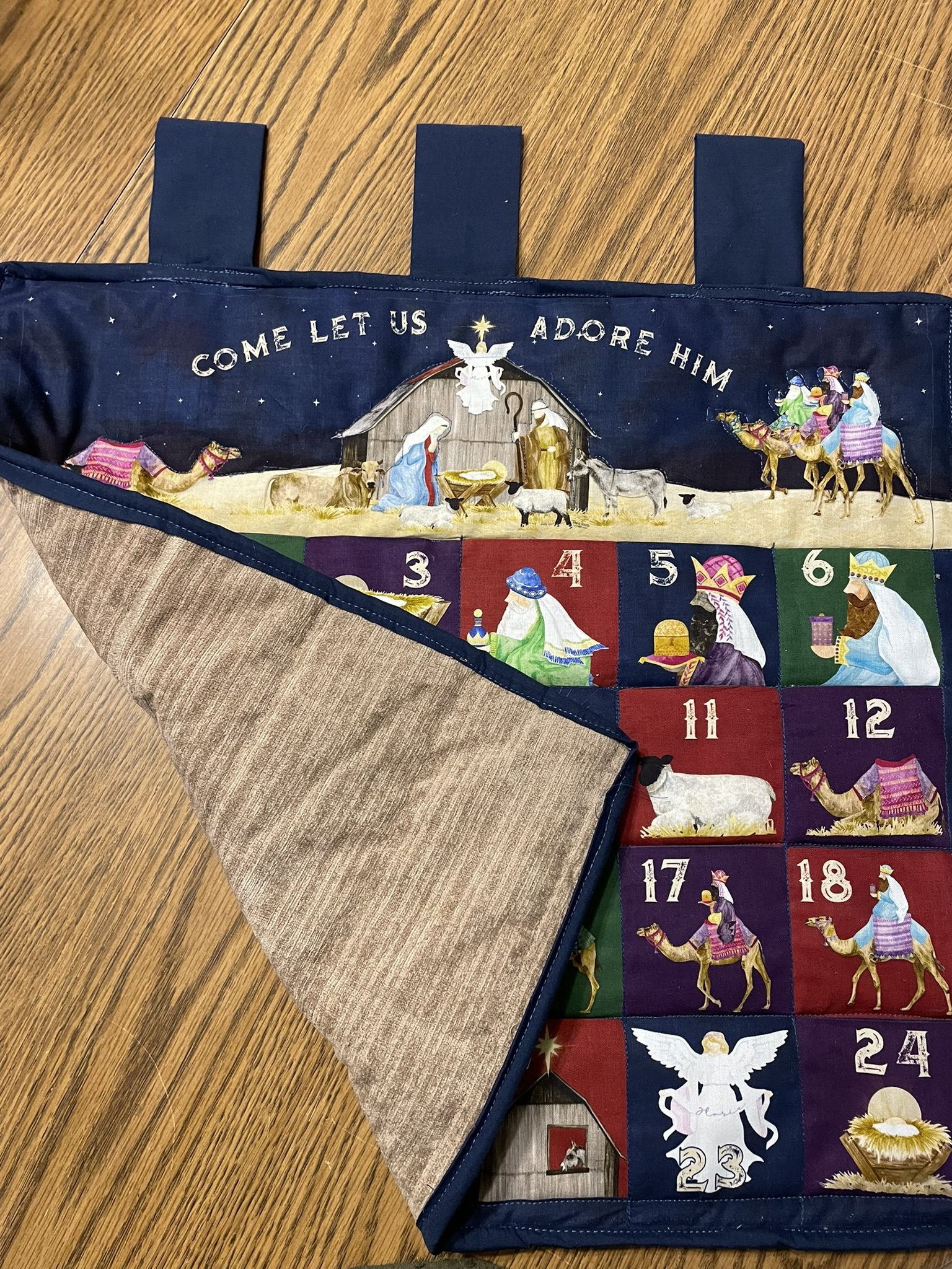 Celebrate the Christmas season with this quilted Nativity advent calendar. Your child will love counting down the days until Christmas with a treat in each pocket. Add scriptures in each pocket to teach the biblical passages that describe the nativity story. The pockets are 3″ x 3″ and the top of the calendar contains tabs to insert a dowel to hang it up.